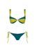 Bra style top with adjustable shoulder straps with knotted detail and matching self tie strappy cheeky bottom. This bikin comes with a canvas boibá pouch. Removable Padding/ Adjustable Straps/ Shimmer Fabric Details/ Moderate Coverage Model is 1.77 cm, bust 84...