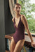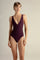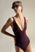 Deep v neck one piece in burgundy color, wide straps and z closure with two adjustable positions, removable padding, gold- plated details to avoid oxidation, uv protection fabric. Color burgundy, Ref. 0E55V61Type of fabric: KnittedHas lining: YesECO Product: NotWith UPF...